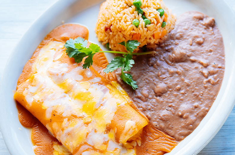 (2) Enchiladas filled with your choice of ground beef, ranchero chicken, cheese, veggies or spinach.