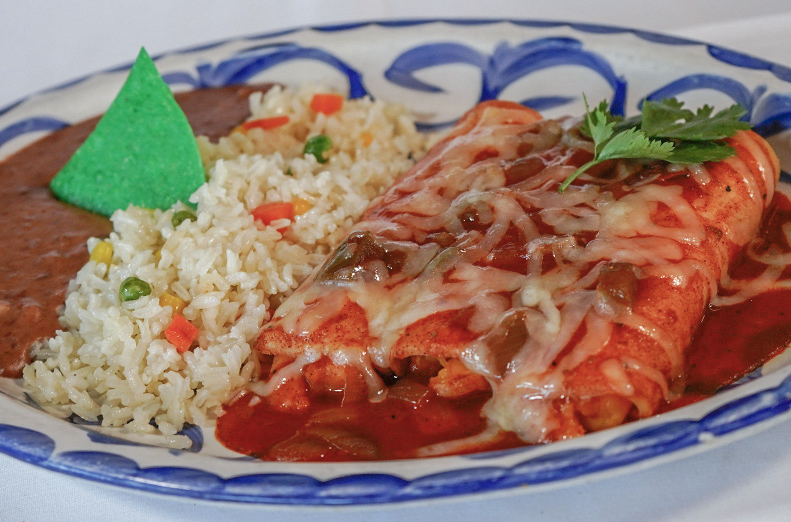 Our homemade large flour tortilla filled with refried beans, ground beef or ranchero chicken, sour cream, tomatoes and lettuce topped with chile con queso and served with rice.