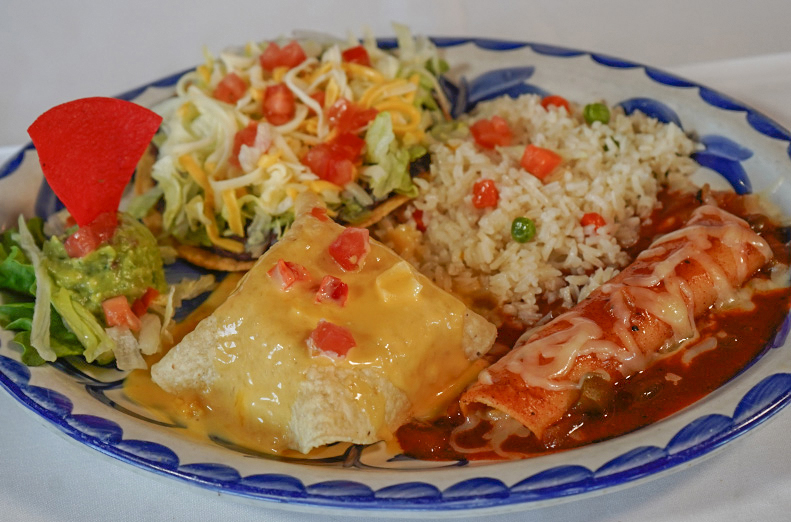(3) Ground beef, ranchero chicken, or cheese enchiladas topped with chile con carne and chile con queso sauce.
