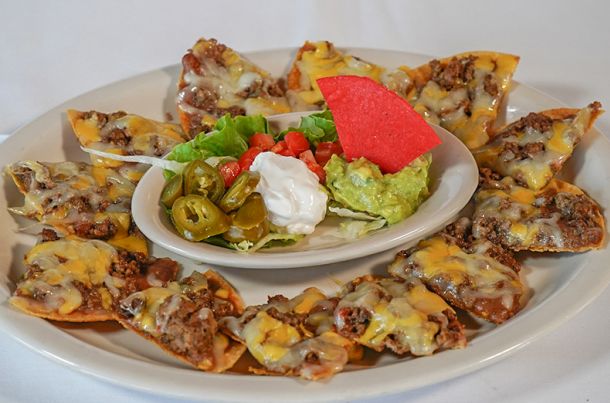 (2) Crispy chalupas layered with beans, ground beef or ranchero chicken, shredded lettuce, grated cheese and tomatoes served with guacamole and sour cream.