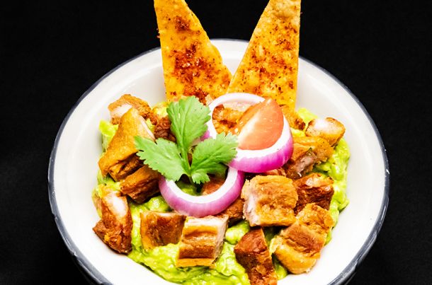 A perfect blend of crispy and tender! Golden pork served with rice, refried beans, guacamole and pico de gallo.