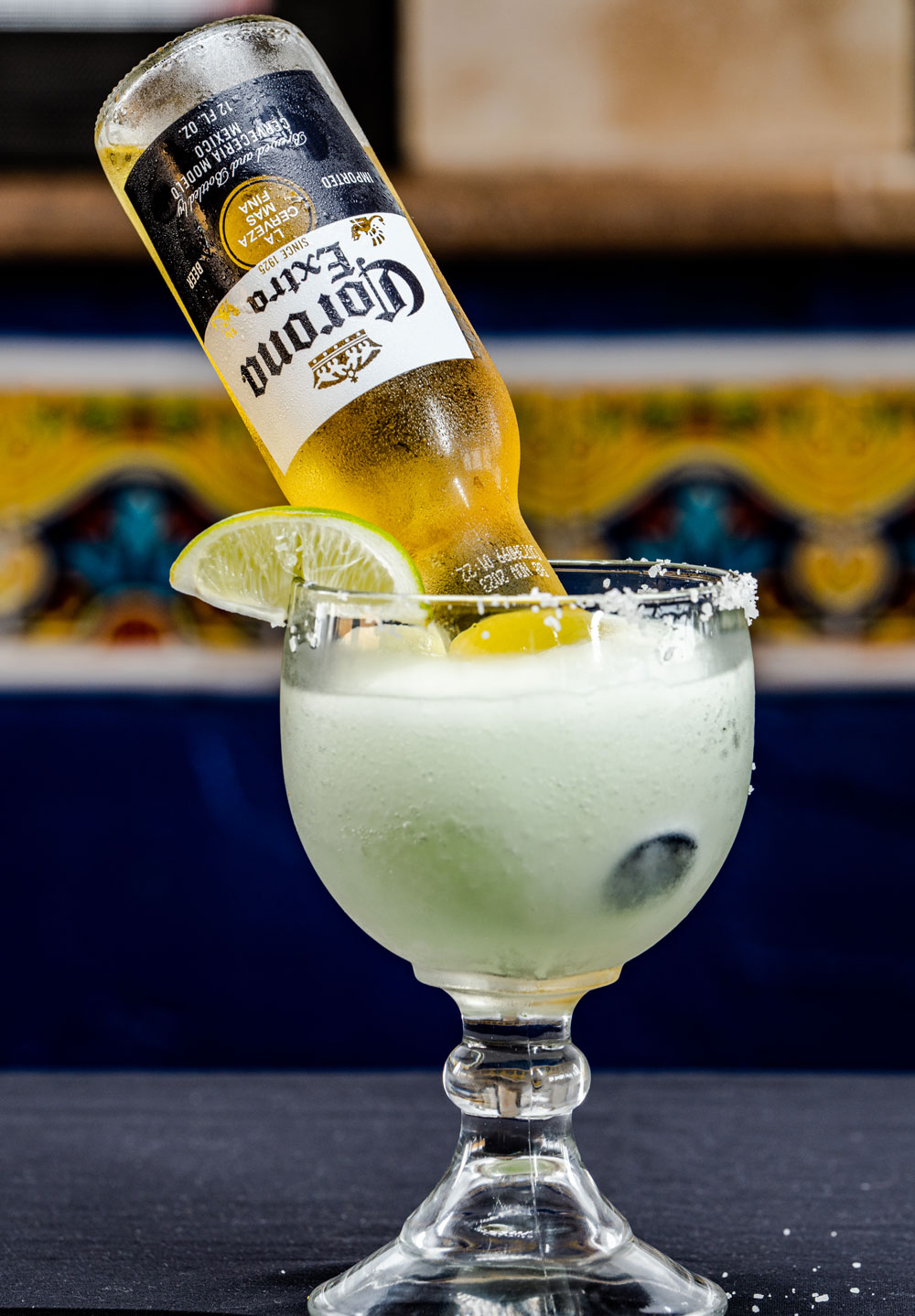 Enjoy the perfect combination of 18 oz of house margarita with your choice 12oz bottled beer turned upside down. 16