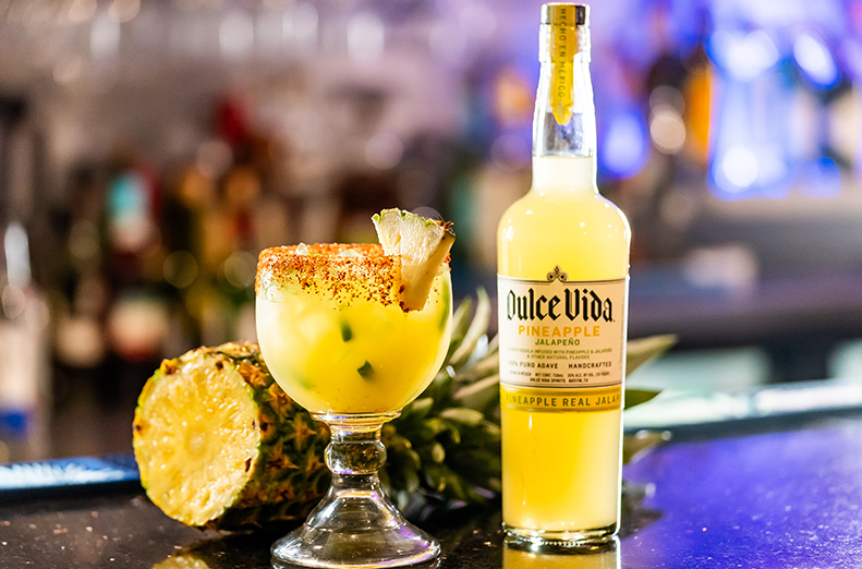 Dulce Vida Pineapple Jalapeno Tequila, Fresh Squeezed Lime Juice, Pineapple Juice, Honey Syrup and Jalapeno.