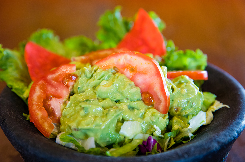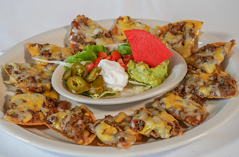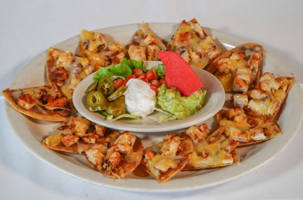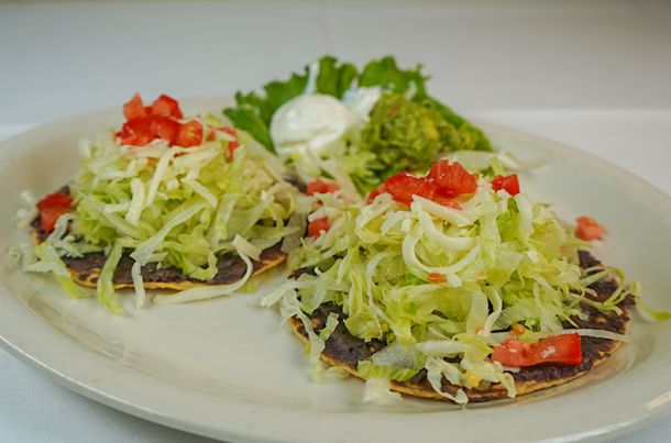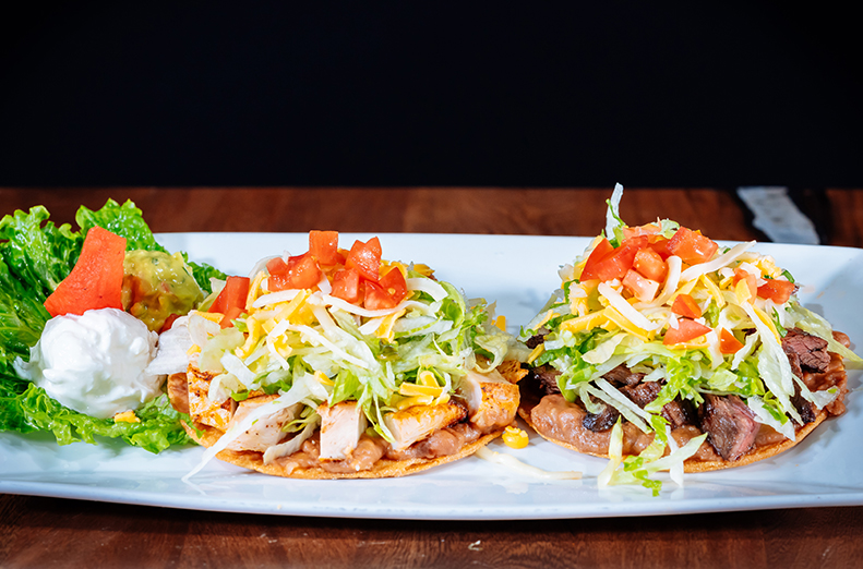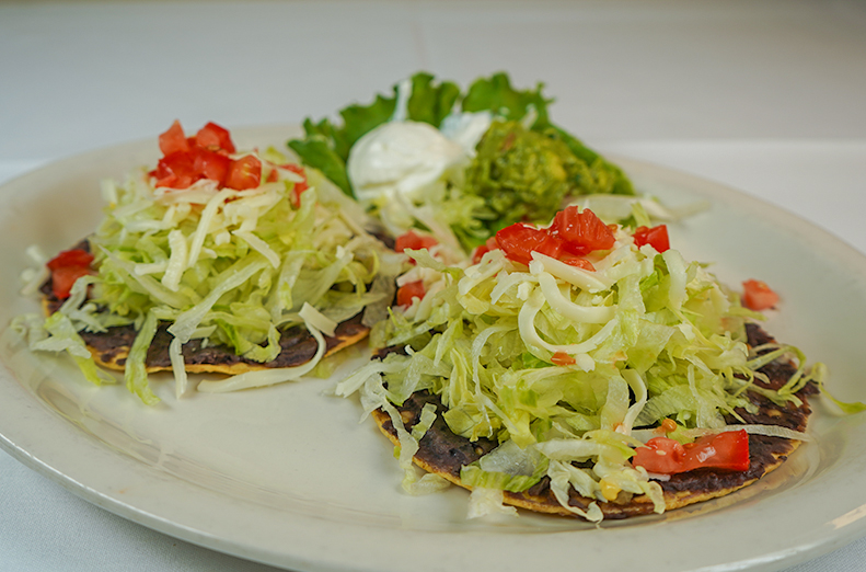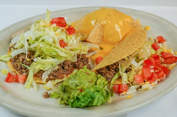 (2) Crispy chalupas layered with beans, ground beef or ranchero chicken, shredded lettuce, grated cheese and tomatoes served with guacamole and sour cream.