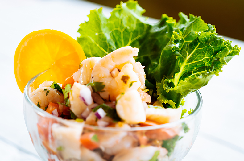 Shrimp, scallops, and fish marinated in lemon/lime juice and mixed with pico de gallo.