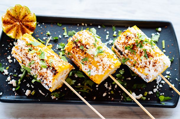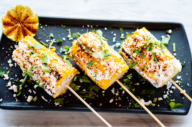 (3) Corn roasted on the grill topped with mayonnaise, queso fresco, cilantro and tajin.