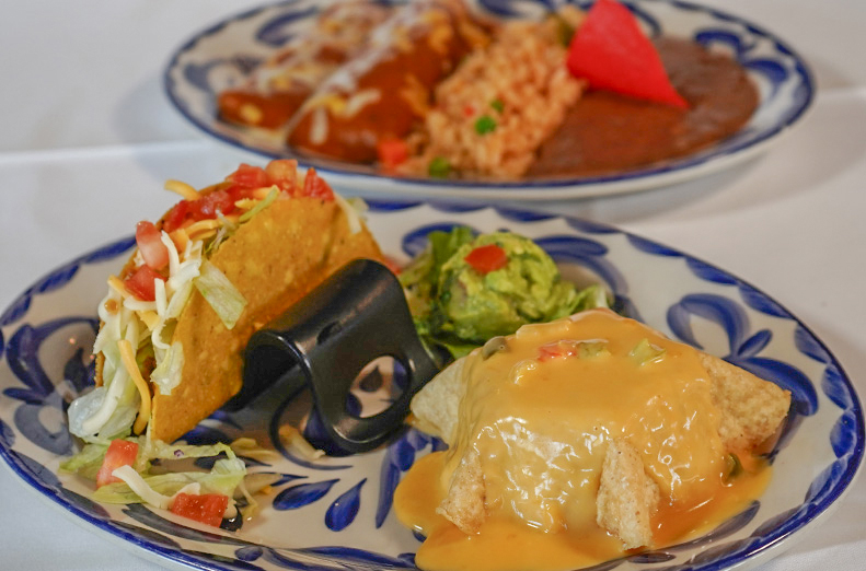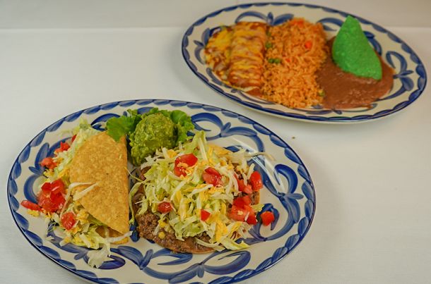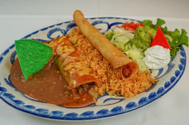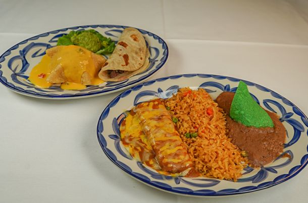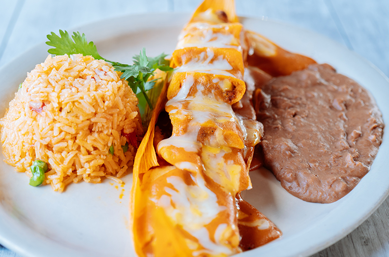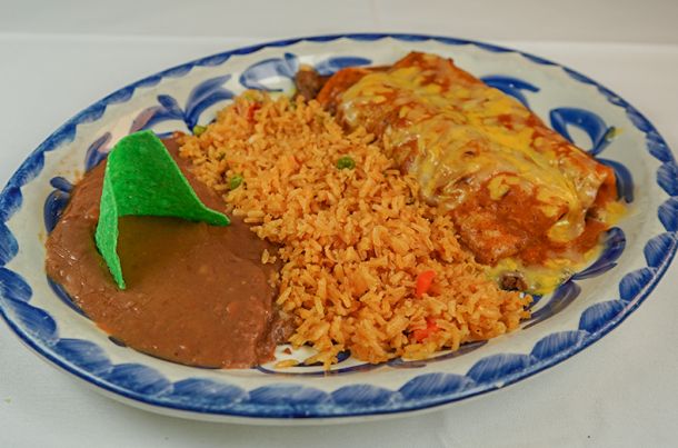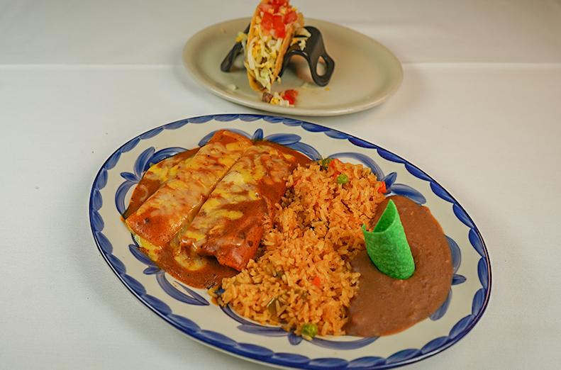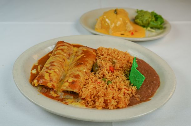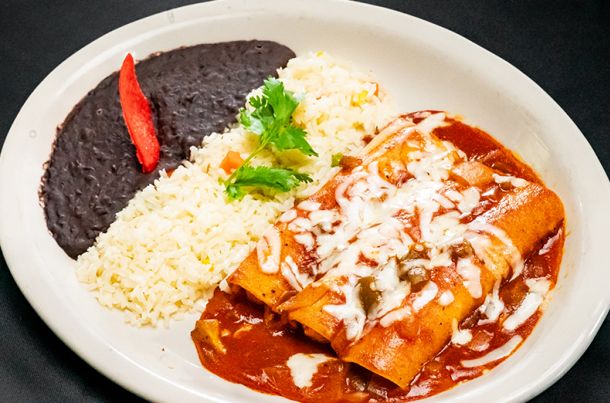 (2) Enchiladas filled with your choice of ground beef, ranchero chicken, cheese, veggies or spinach.