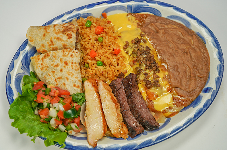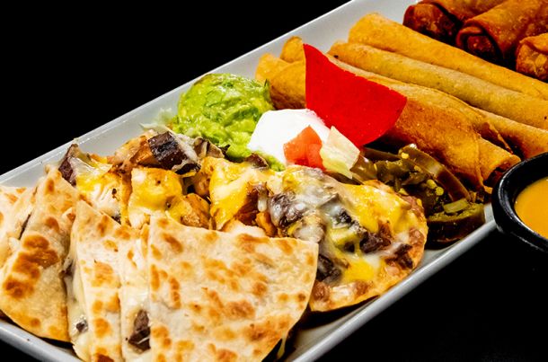 Beef and chicken taquitos, egg rolls, a chicken fajita quesadilla, beef and chicken fajita nachos, served with chile con queso, sour cream and guacamole for dipping.
