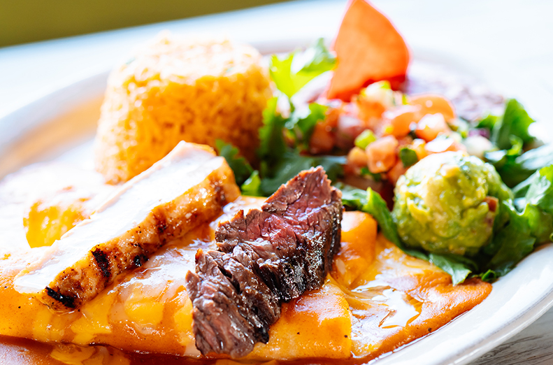 (2) Cheese enchiladas topped with your choice of beef or chicken fajita strips served with guacamole and pico de gallo.