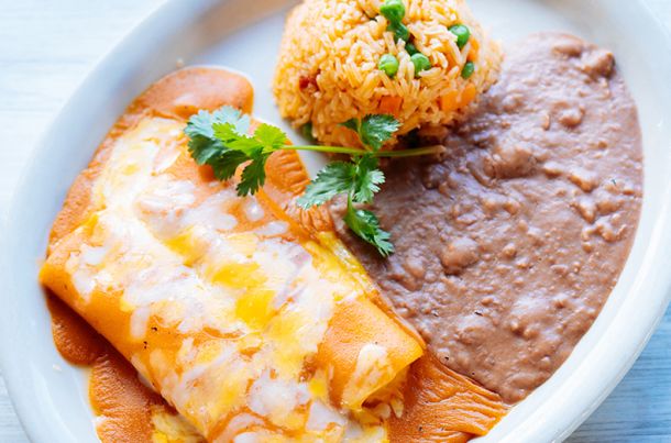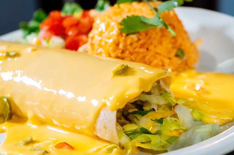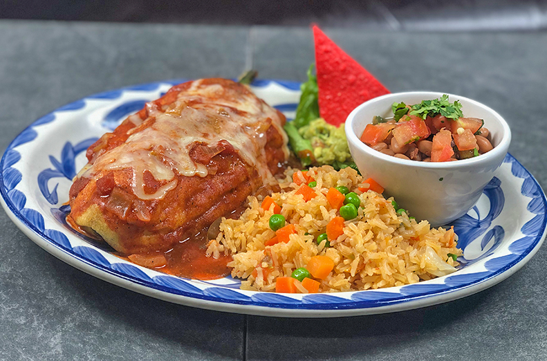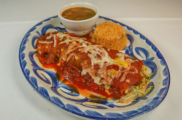 Our homemade large flour tortilla filled with refried beans, ground beef or ranchero chicken, sour cream, tomatoes and lettuce topped with chile con queso and served with rice.
