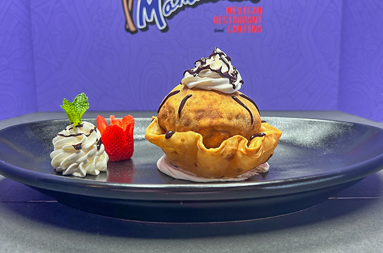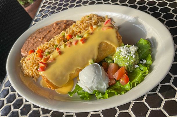 Ground beef or chicken ranchero in a large flour tortilla deep fried then topped with chile con queso served with rice, refried beans, guacamole and sour cream.