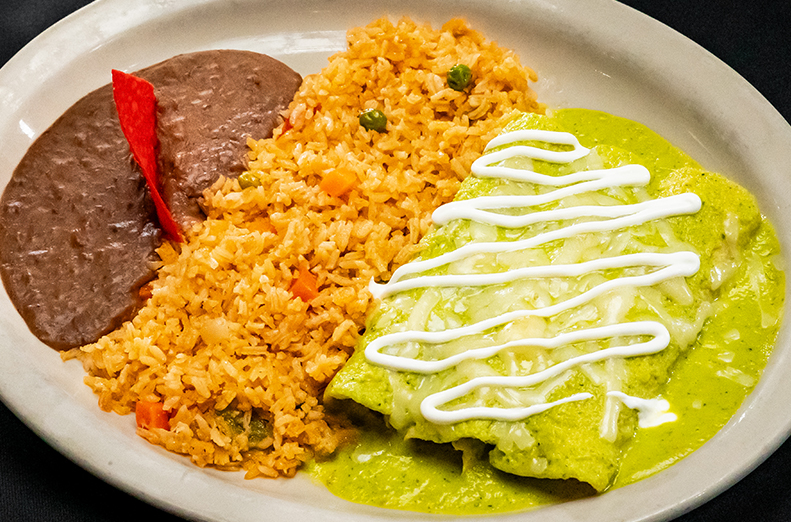 (3) Chicken enchiladas topped with our homemade traditional tomatillo sauce, Monterey Jack cheese and sour cream.