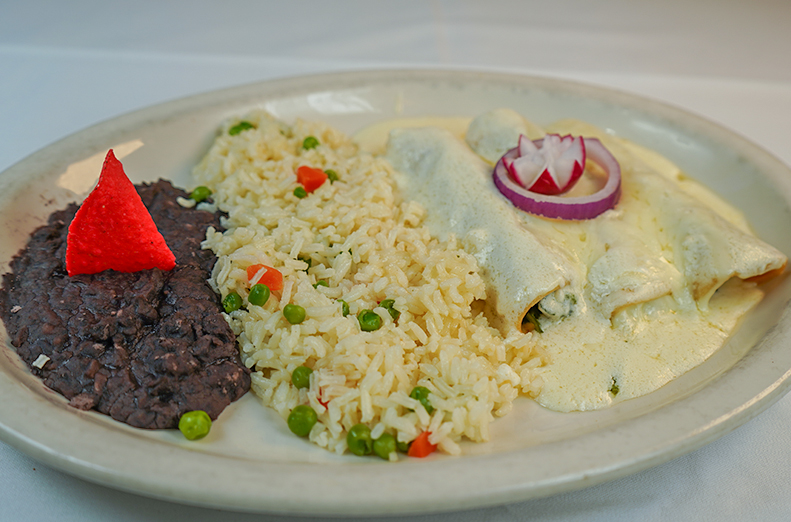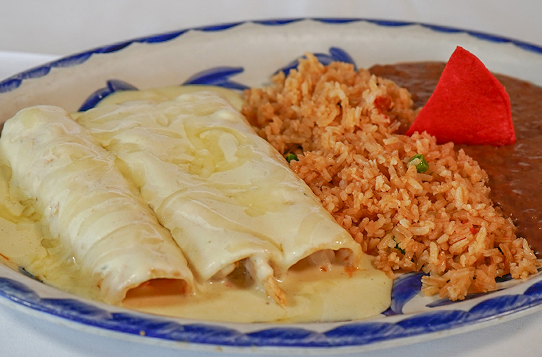 (3) Chicken enchiladas topped with our sour cream sauce and Monterey Jack cheese.
