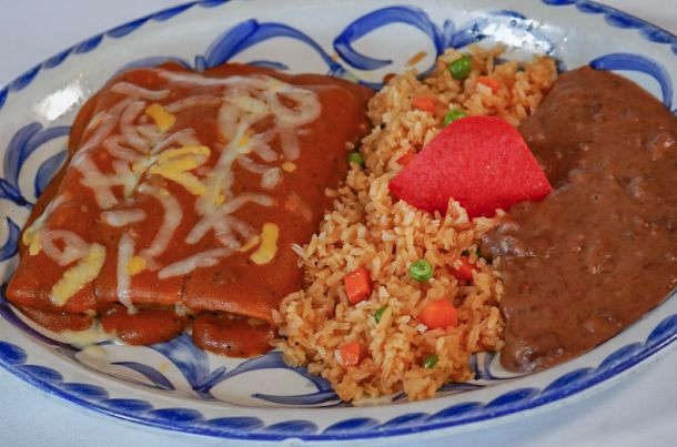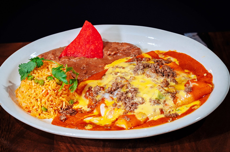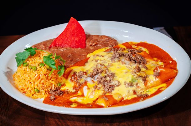 (3) Ground beef, ranchero chicken, or cheese enchiladas topped with chile con carne and chile con queso sauce.