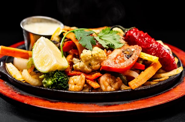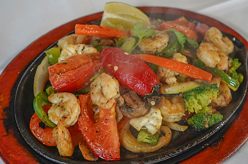 Tomatoes, onions, bell peppers, mushrooms, squash, zucchini, cauliflower, broccoli, carrots, and poblano peppers all sautéed to perfection and served on a sizzling platter. Served with pico de gallo, guacamole, black beans, white rice and tortillas.