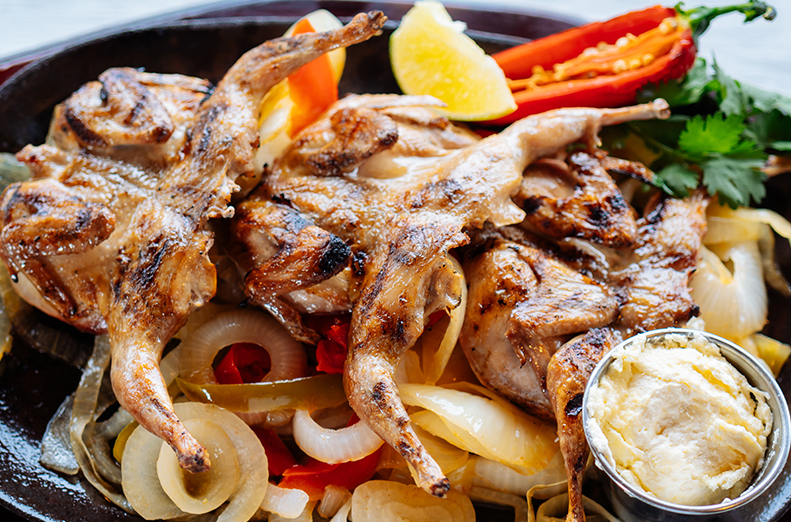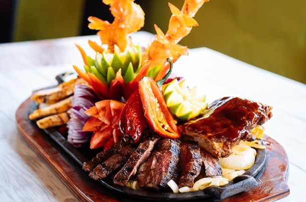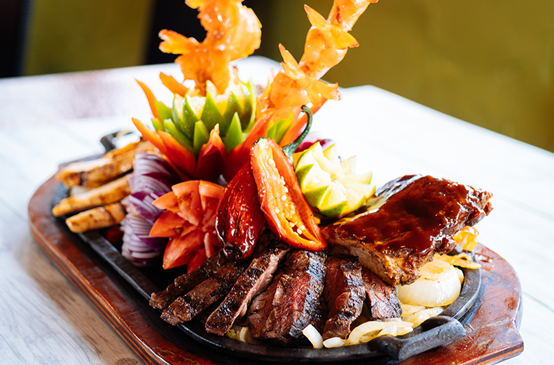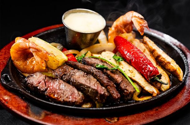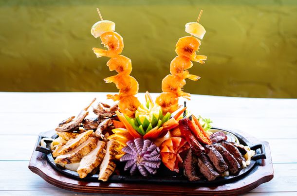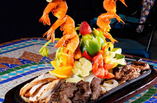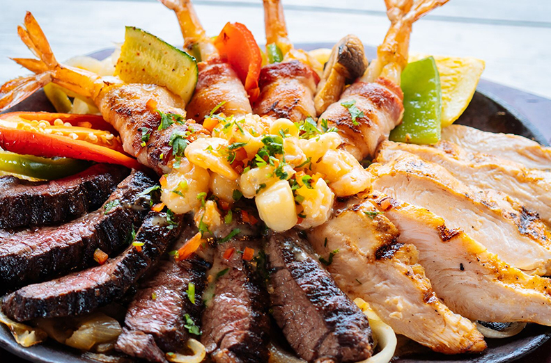 Beef and chicken fajitas, jalapeño and cheese sausage, two quail, and 8 jumbo shrimp.