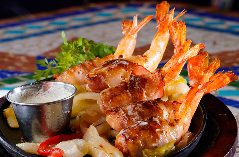 (6) Bacon-wrapped grilled shrimp stuffed with jalapeño and topped with Monterey Jack Cheese.