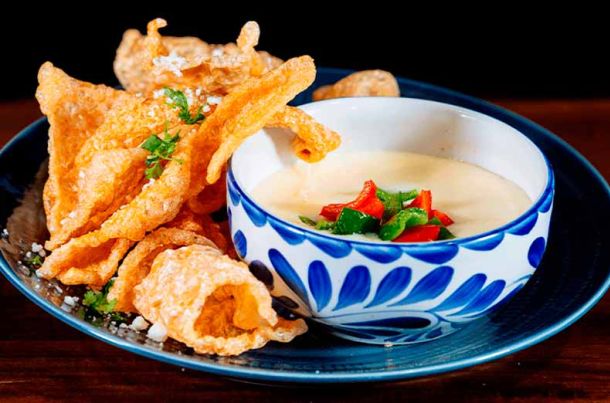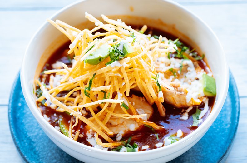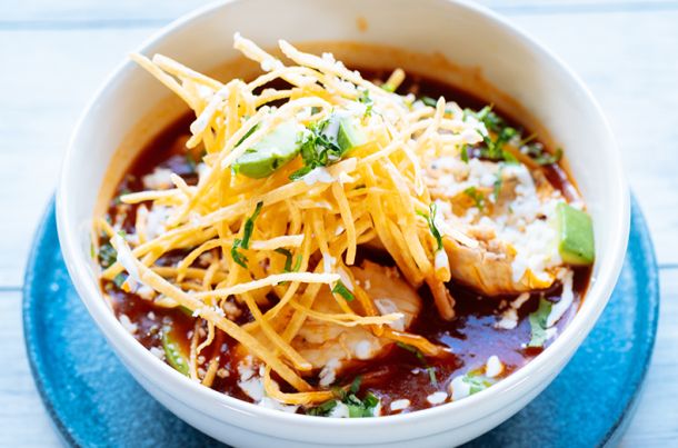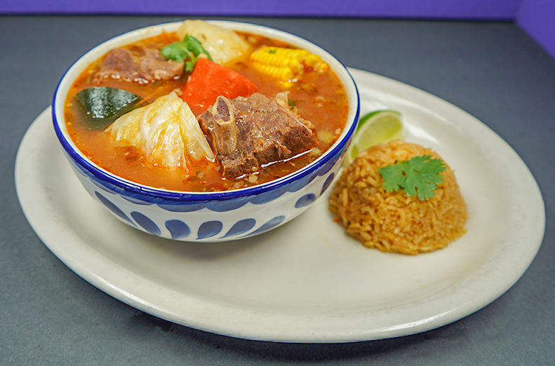 A hearty chicken soup made with tomato and chipotle in perfect balance...topped with tortilla strips, queso fresco, avocado and sour cream served with rice.