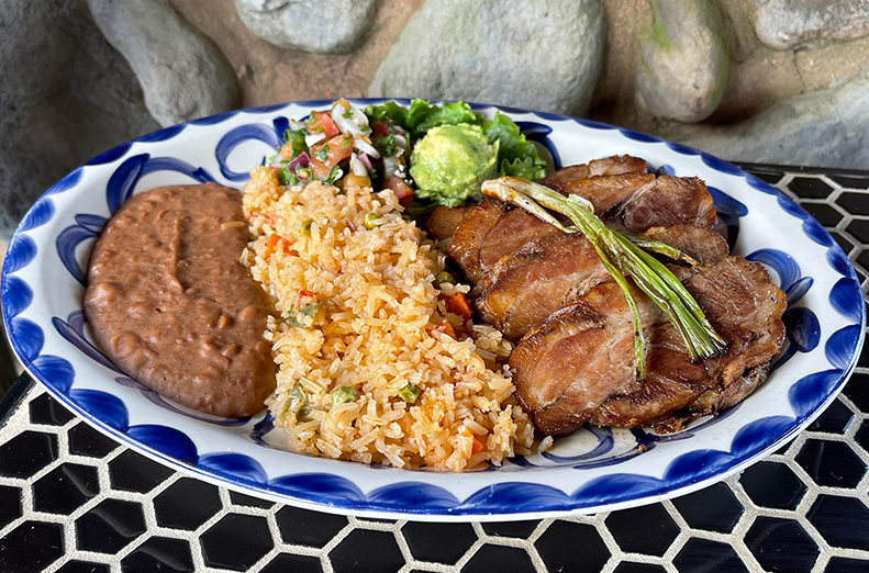 A perfect blend of crispy and tender! Golden pork served with rice, refried beans, guacamole and pico de gallo.