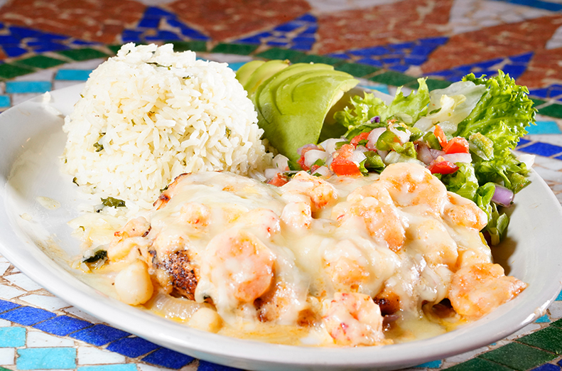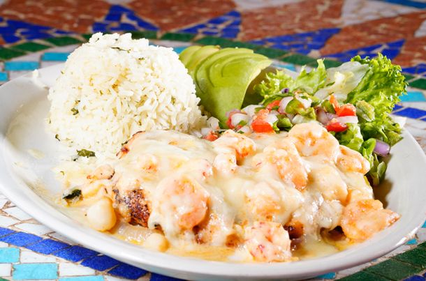 Grilled chicken breast or grilled fish topped with shrimp, scallops and crawfish tails in our special house white wine sauce. Served with rice, charro beans, pico de gallo and avocado slices.