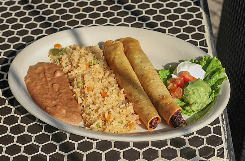 (2) Crispy ranchero chicken or beef brisket flautas, served with rice, refried beans, guacamole and sour cream.