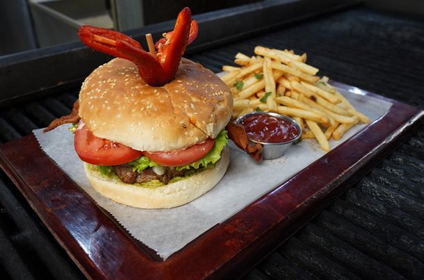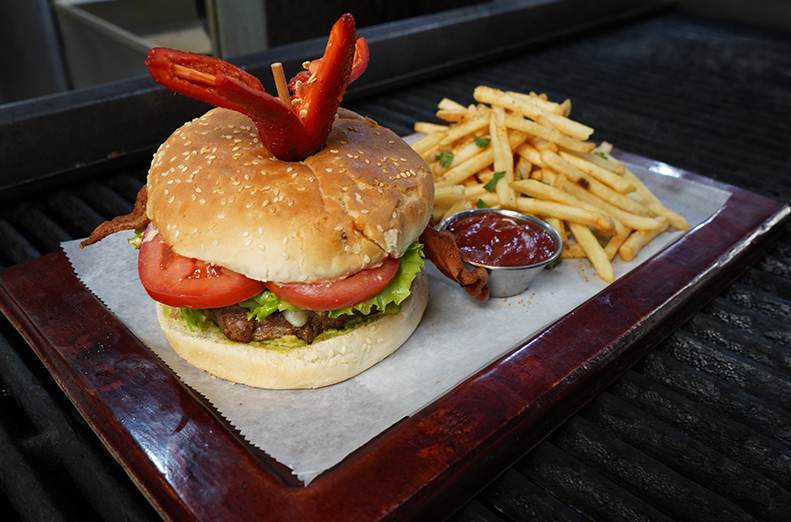 Half pound craft patty stuffed with mixed cheese and pico de gallo then topped with ham, lettuce, tomato, guacamole and chipotle remoulade sauce, served with french fries.