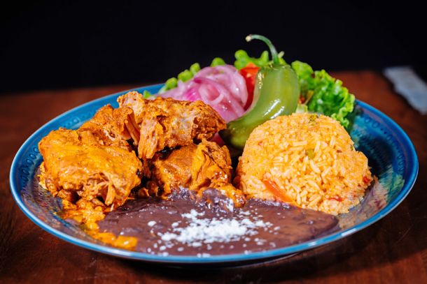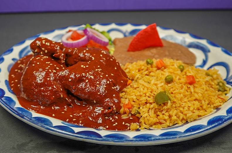 Tender chicken slowly cooked in our traditional mole sauce, served with rice, refried beans and tortillas.