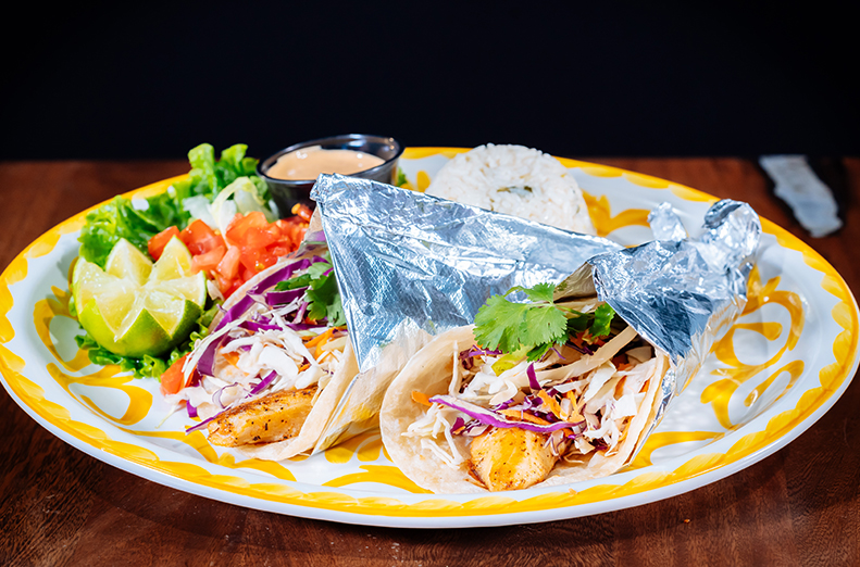 (2) Grilled or fried fish fillets topped with cabbage and chipotle rémoulade sauce in warm corn or flour tortillas.