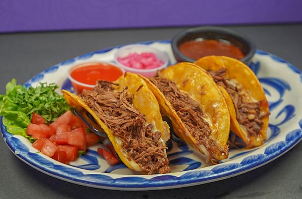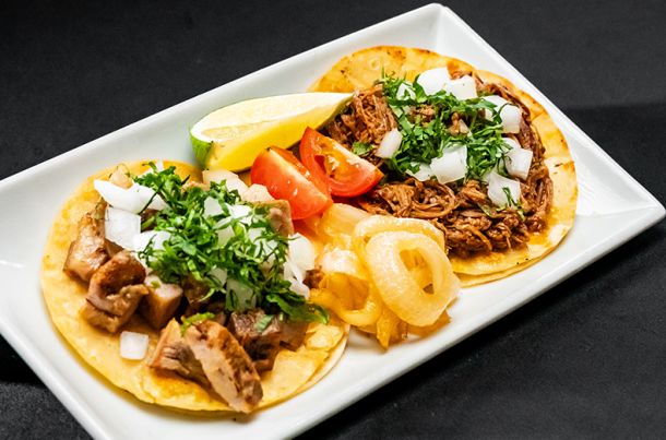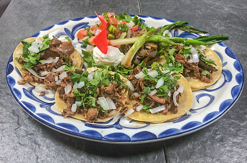 (4) Small corn tortilla tacos with your choice of carnitas or brisket, served with guacamole, sour cream and charro beans.
