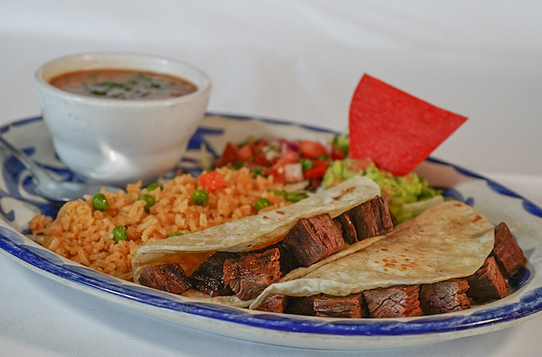 (2) Flour tortillas loaded with charbroiled beef or chicken fajitas, served with guacamole, pico de gallo, frijoles a la charra and rice.