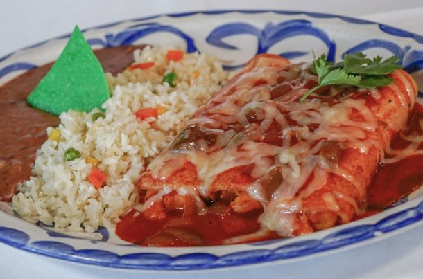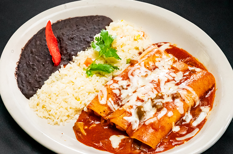 (3) Enchiladas filled with mixed vegetables and topped with Spanish sauce and shredded cheese, served with white rice and refried black beans.