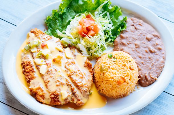 Breaded chicken breast topped with chile con queso. Served with rice, refried beans, guacamole and sour cream.