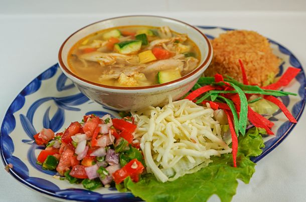 A tasty traditional chicken soup with fresh vegetables, served with Monterey Jack cheese, sliced avocados, rice, pico de gallo and tortilla strips.