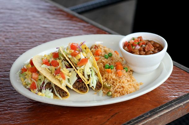 (3) Crispy tacos with ground beef or ranchero chicken, served with rice and refried beans.