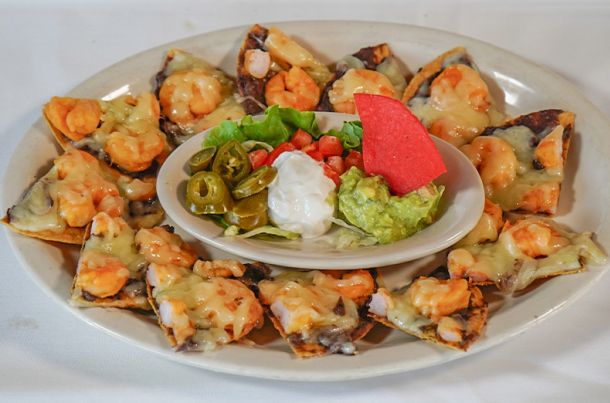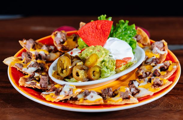Homemade tortillas chips topped with beans and cheese. Served with guacamole, jalapeños and sour cream.