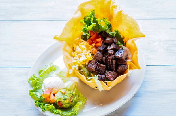 Choice of ground beef or ranchero chicken in a crisp flour tortilla shell with diced tomato and grated cheese over a bed of lettuce served with guacamole and sour cream.