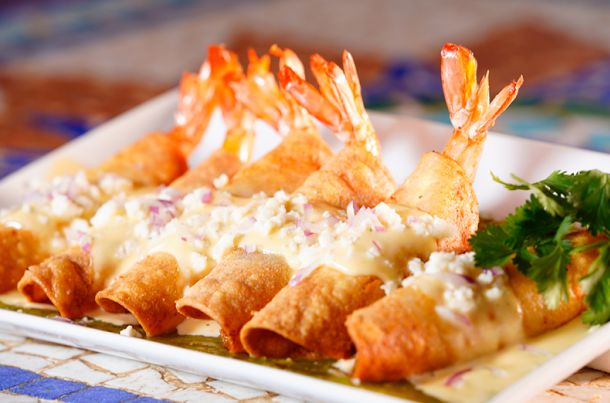 (6) Crispy shrimp taquitos served on a bed of tomatillo sauce then topped with a delicious creamy mango habanero sauce, queso fresco, and diced red onion
