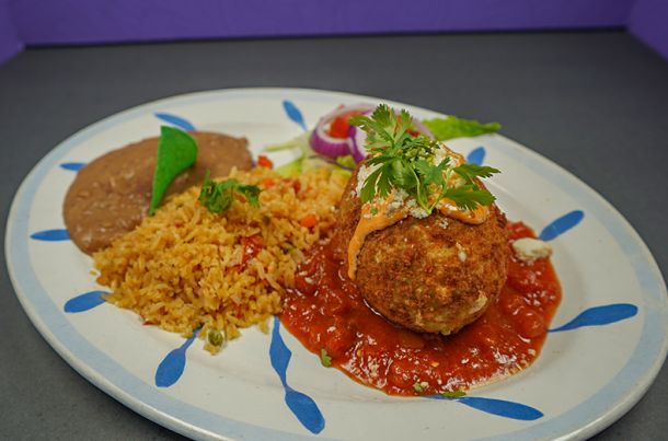 Battered poblano pepper with your choice of ground beef, ranchero chicken or Monterey Jack Cheese, served with rice, refried beans and guacamole.