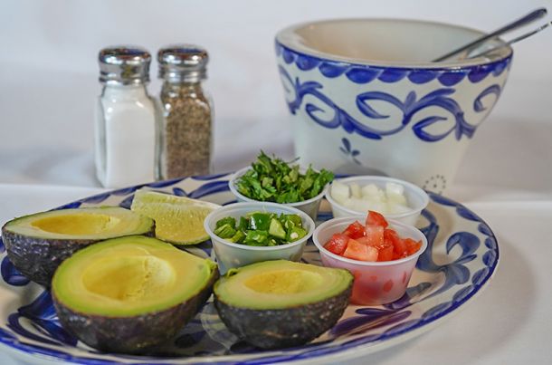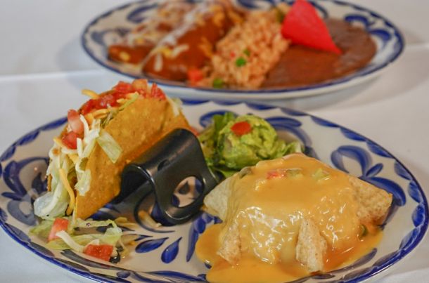 (1) Beef or chicken fajita taco, cheese enchilada, one chile con queso tostada and guacamole.