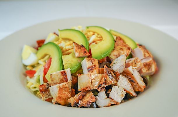 Diced beef or chicken fajita , avocado, boiled eggs, american cheese, black olives, bacon and tomatoes over a bed of crispy lettuce.