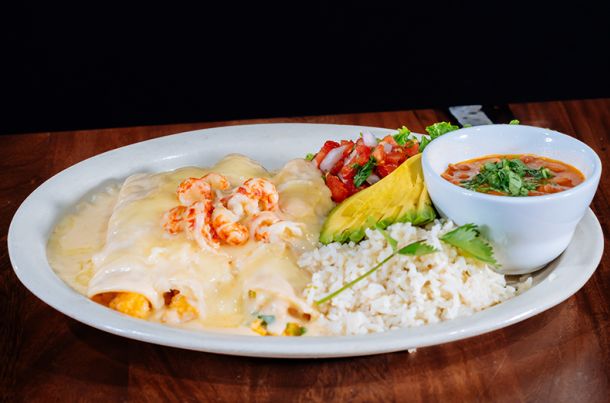 (3) Monterey Jack Cheese enchiladas filled with shrimp, scallops, crawfish tails in a white wine sauce. Served with white rice, charro beans and sliced avocado